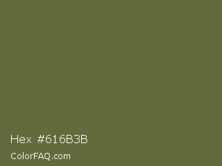 Hex #616b3b Color is a normal lime color and the nearest color is Verdigris #5d5e37. Hex code #616b3b and RGB value is rgb(97,107,59). In RGB color space, this color is composed of 38% red, 42% green, 23% blue, In CMYK color space, this color is composed of 9% cyan, 0% magenta, 45% yellow , 58% black , In HSL color space, this color has a hue angle of 73° , 29% saturation and 33% lightness.