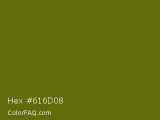 Hex #616d08 Color is a dark yellow color and the nearest color is Olivetone #716e10. Hex code #616d08 and RGB value is rgb(97,109,8). In RGB color space, this color is composed of 38% red, 43% green, 3% blue, In CMYK color space, this color is composed of 11% cyan, 0% magenta, 93% yellow , 57% black , In HSL color space, this color has a hue angle of 67° , 86% saturation and 23% lightness.