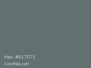 Hex #617071 Color is a normal cyan color and the nearest color is Nevada #646e75. Hex code #617071 and RGB value is rgb(97,112,113). In RGB color space, this color is composed of 38% red, 44% green, 44% blue, In CMYK color space, this color is composed of 14% cyan, 1% magenta, 0% yellow , 56% black , In HSL color space, this color has a hue angle of 184° , 8% saturation and 41% lightness.
