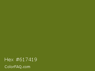 Hex #617419 Color is a dark lime color and the nearest color is Fern Frond #657220. Hex code #617419 and RGB value is rgb(97,116,25). In RGB color space, this color is composed of 38% red, 45% green, 10% blue, In CMYK color space, this color is composed of 16% cyan, 0% magenta, 78% yellow , 55% black , In HSL color space, this color has a hue angle of 73° , 65% saturation and 28% lightness.