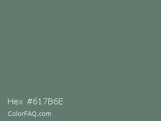 Hex #617b6e Color is a normal green color and the nearest color is Corduroy #606e68. Hex code #617b6e and RGB value is rgb(97,123,110). In RGB color space, this color is composed of 38% red, 48% green, 43% blue, In CMYK color space, this color is composed of 21% cyan, 0% magenta, 11% yellow , 52% black , In HSL color space, this color has a hue angle of 150° , 12% saturation and 43% lightness.