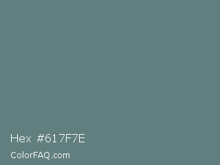 Hex #617f7e Color is a normal cyan color and the nearest color is Aurometalsaurus #6e7f80. Hex code #617f7e and RGB value is rgb(97,127,126). In RGB color space, this color is composed of 38% red, 50% green, 49% blue, In CMYK color space, this color is composed of 24% cyan, 0% magenta, 1% yellow , 50% black , In HSL color space, this color has a hue angle of 178° , 13% saturation and 44% lightness.
