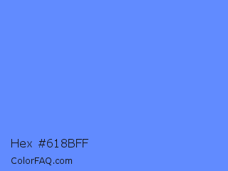 Hex #618bff Color is a light blue color and the nearest color is Blueberry #4f86f7. Hex code #618bff and RGB value is rgb(97,139,255). In RGB color space, this color is composed of 38% red, 55% green, 100% blue, In CMYK color space, this color is composed of 62% cyan, 45% magenta, 0% yellow , 0% black , In HSL color space, this color has a hue angle of 224° , 100% saturation and 69% lightness.