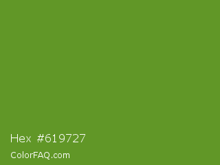 Hex #619727 Color is a normal green color and the nearest color is Olive Drab #6b8e23. Hex code #619727 and RGB value is rgb(97,151,39). In RGB color space, this color is composed of 38% red, 59% green, 15% blue, In CMYK color space, this color is composed of 36% cyan, 0% magenta, 74% yellow , 41% black , In HSL color space, this color has a hue angle of 89° , 59% saturation and 37% lightness.