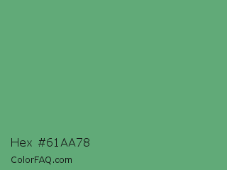 Hex #61aa78 Color is a normal green color and the nearest color is Shiny Shamrock #5fa778. Hex code #61aa78 and RGB value is rgb(97,170,120). In RGB color space, this color is composed of 38% red, 67% green, 47% blue, In CMYK color space, this color is composed of 43% cyan, 0% magenta, 29% yellow , 33% black , In HSL color space, this color has a hue angle of 139° , 30% saturation and 52% lightness.