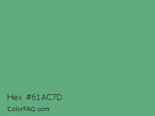Hex #61ac7d Color is a normal green color and the nearest color is Shiny Shamrock #5fa778. Hex code #61ac7d and RGB value is rgb(97,172,125). In RGB color space, this color is composed of 38% red, 67% green, 49% blue, In CMYK color space, this color is composed of 44% cyan, 0% magenta, 27% yellow , 33% black , In HSL color space, this color has a hue angle of 142° , 31% saturation and 53% lightness.