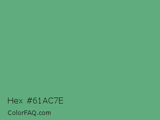 Hex #61ac7e Color is a normal green color and the nearest color is Shiny Shamrock #5fa778. Hex code #61ac7e and RGB value is rgb(97,172,126). In RGB color space, this color is composed of 38% red, 67% green, 49% blue, In CMYK color space, this color is composed of 44% cyan, 0% magenta, 27% yellow , 33% black , In HSL color space, this color has a hue angle of 143° , 31% saturation and 53% lightness.