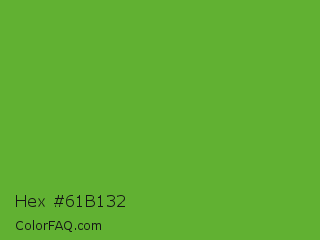 Hex #61b132 Color is a normal green color and the nearest color is Green RYB #66b032. Hex code #61b132 and RGB value is rgb(97,177,50). In RGB color space, this color is composed of 38% red, 69% green, 20% blue, In CMYK color space, this color is composed of 45% cyan, 0% magenta, 72% yellow , 31% black , In HSL color space, this color has a hue angle of 98° , 56% saturation and 45% lightness.