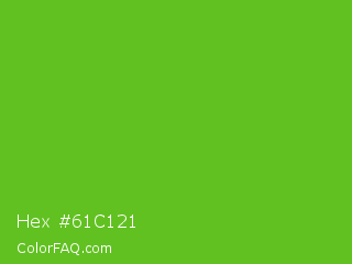 Hex #61c121 Color is a normal green color and the nearest color is Lima #76bd17. Hex code #61c121 and RGB value is rgb(97,193,33). In RGB color space, this color is composed of 38% red, 76% green, 13% blue, In CMYK color space, this color is composed of 50% cyan, 0% magenta, 83% yellow , 24% black , In HSL color space, this color has a hue angle of 96° , 71% saturation and 44% lightness.