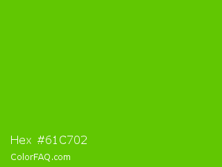Hex #61c702 Color is a normal green color and the nearest color is Lima #76bd17. Hex code #61c702 and RGB value is rgb(97,199,2). In RGB color space, this color is composed of 38% red, 78% green, 1% blue, In CMYK color space, this color is composed of 51% cyan, 0% magenta, 99% yellow , 22% black , In HSL color space, this color has a hue angle of 91° , 98% saturation and 39% lightness.