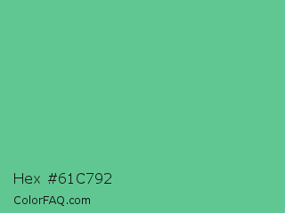 Hex #61c792 Color is a normal green color and the nearest color is Silver Tree #66b58f. Hex code #61c792 and RGB value is rgb(97,199,146). In RGB color space, this color is composed of 38% red, 78% green, 57% blue, In CMYK color space, this color is composed of 51% cyan, 0% magenta, 27% yellow , 22% black , In HSL color space, this color has a hue angle of 149° , 48% saturation and 58% lightness.