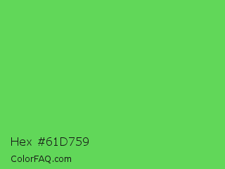 Hex #61d759 Color is a normal green color and the nearest color is Mantis #74c365. Hex code #61d759 and RGB value is rgb(97,215,89). In RGB color space, this color is composed of 38% red, 84% green, 35% blue, In CMYK color space, this color is composed of 55% cyan, 0% magenta, 59% yellow , 16% black , In HSL color space, this color has a hue angle of 116° , 61% saturation and 60% lightness.