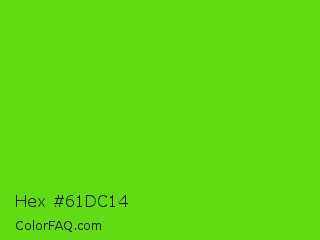 Hex #61dc14 Color is a normal green color and the nearest color is Harlequin Green #46cb18. Hex code #61dc14 and RGB value is rgb(97,220,20). In RGB color space, this color is composed of 38% red, 86% green, 8% blue, In CMYK color space, this color is composed of 56% cyan, 0% magenta, 91% yellow , 14% black , In HSL color space, this color has a hue angle of 97° , 83% saturation and 47% lightness.