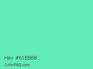 Hex #61ebb8 Color is a light green color and the nearest color is Medium Aquamarine #66ddaa. Hex code #61ebb8 and RGB value is rgb(97,235,184). In RGB color space, this color is composed of 38% red, 92% green, 72% blue, In CMYK color space, this color is composed of 59% cyan, 0% magenta, 22% yellow , 8% black , In HSL color space, this color has a hue angle of 158° , 78% saturation and 65% lightness.