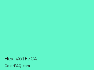 Hex #61f7ca Color is a light green color and the nearest color is Aquamarine #7fffd4. Hex code #61f7ca and RGB value is rgb(97,247,202). In RGB color space, this color is composed of 38% red, 97% green, 79% blue, In CMYK color space, this color is composed of 61% cyan, 0% magenta, 18% yellow , 3% black , In HSL color space, this color has a hue angle of 162° , 90% saturation and 67% lightness.