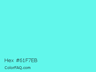 Hex #61f7eb Color is a light cyan color and the nearest color is Turquoise Blue #6cdae7. Hex code #61f7eb and RGB value is rgb(97,247,235). In RGB color space, this color is composed of 38% red, 97% green, 92% blue, In CMYK color space, this color is composed of 61% cyan, 0% magenta, 5% yellow , 3% black , In HSL color space, this color has a hue angle of 175° , 90% saturation and 67% lightness.