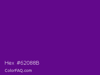 Hex #62088b Color is a dark purple color and the nearest color is Purple #660099. Hex code #62088b and RGB value is rgb(98,8,139). In RGB color space, this color is composed of 38% red, 3% green, 55% blue, In CMYK color space, this color is composed of 29% cyan, 94% magenta, 0% yellow , 45% black , In HSL color space, this color has a hue angle of 281° , 89% saturation and 29% lightness.