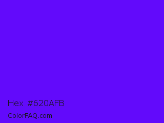 Hex #620afb Color is a normal violet color and the nearest color is Electric Indigo #6f00ff. Hex code #620afb and RGB value is rgb(98,10,251). In RGB color space, this color is composed of 38% red, 4% green, 98% blue, In CMYK color space, this color is composed of 61% cyan, 96% magenta, 0% yellow , 2% black , In HSL color space, this color has a hue angle of 262° , 97% saturation and 51% lightness.