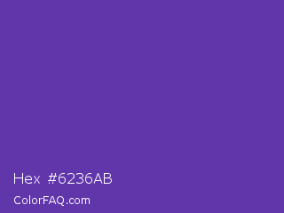 Hex #6236ab Color is a normal violet color and the nearest color is Grape #6f2da8. Hex code #6236ab and RGB value is rgb(98,54,171). In RGB color space, this color is composed of 38% red, 21% green, 67% blue, In CMYK color space, this color is composed of 43% cyan, 68% magenta, 0% yellow , 33% black , In HSL color space, this color has a hue angle of 263° , 52% saturation and 44% lightness.