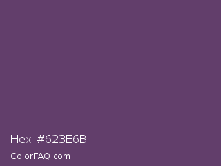 Hex #623e6b Color is a normal purple color and the nearest color is Imperial #602f6b. Hex code #623e6b and RGB value is rgb(98,62,107). In RGB color space, this color is composed of 38% red, 24% green, 42% blue, In CMYK color space, this color is composed of 8% cyan, 42% magenta, 0% yellow , 58% black , In HSL color space, this color has a hue angle of 288° , 27% saturation and 33% lightness.