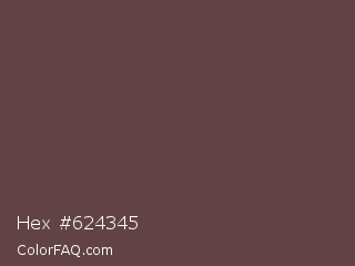 Hex #624345 Color is a normal red color and the nearest color is Rose Ebony #674846. Hex code #624345 and RGB value is rgb(98,67,69). In RGB color space, this color is composed of 38% red, 26% green, 27% blue, In CMYK color space, this color is composed of 0% cyan, 32% magenta, 30% yellow , 62% black , In HSL color space, this color has a hue angle of 356° , 19% saturation and 32% lightness.