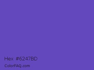 Hex #6247bd Color is a normal indigo color and the nearest color is Plump Purple #5946b2. Hex code #6247bd and RGB value is rgb(98,71,189). In RGB color space, this color is composed of 38% red, 28% green, 74% blue, In CMYK color space, this color is composed of 48% cyan, 62% magenta, 0% yellow , 26% black , In HSL color space, this color has a hue angle of 254° , 47% saturation and 51% lightness.