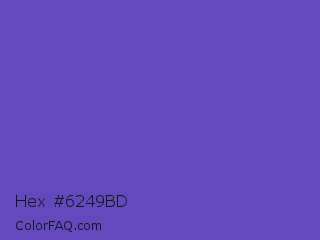 Hex #6249bd Color is a normal indigo color and the nearest color is Blue Violet #6456b7. Hex code #6249bd and RGB value is rgb(98,73,189). In RGB color space, this color is composed of 38% red, 29% green, 74% blue, In CMYK color space, this color is composed of 48% cyan, 61% magenta, 0% yellow , 26% black , In HSL color space, this color has a hue angle of 253° , 47% saturation and 51% lightness.