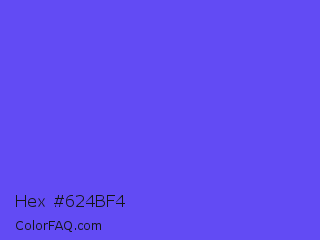Hex #624bf4 Color is a light indigo color and the nearest color is Majorelle Blue #6050dc. Hex code #624bf4 and RGB value is rgb(98,75,244). In RGB color space, this color is composed of 38% red, 29% green, 96% blue, In CMYK color space, this color is composed of 60% cyan, 69% magenta, 0% yellow , 4% black , In HSL color space, this color has a hue angle of 248° , 88% saturation and 63% lightness.