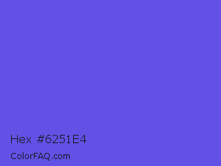 Hex #6251e4 Color is a light indigo color and the nearest color is Majorelle Blue #6050dc. Hex code #6251e4 and RGB value is rgb(98,81,228). In RGB color space, this color is composed of 38% red, 32% green, 89% blue, In CMYK color space, this color is composed of 57% cyan, 64% magenta, 0% yellow , 11% black , In HSL color space, this color has a hue angle of 247° , 73% saturation and 61% lightness.