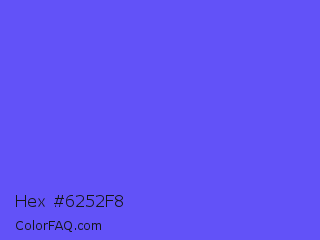 Hex #6252f8 Color is a light indigo color and the nearest color is Very Light Blue #6666ff. Hex code #6252f8 and RGB value is rgb(98,82,248). In RGB color space, this color is composed of 38% red, 32% green, 97% blue, In CMYK color space, this color is composed of 60% cyan, 67% magenta, 0% yellow , 3% black , In HSL color space, this color has a hue angle of 246° , 92% saturation and 65% lightness.