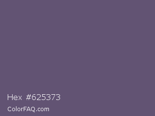 Hex #625373 Color is a normal violet color and the nearest color is Smoky #605b73. Hex code #625373 and RGB value is rgb(98,83,115). In RGB color space, this color is composed of 38% red, 33% green, 45% blue, In CMYK color space, this color is composed of 15% cyan, 28% magenta, 0% yellow , 55% black , In HSL color space, this color has a hue angle of 268° , 16% saturation and 39% lightness.