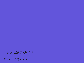 Hex #6255db Color is a normal indigo color and the nearest color is Majorelle Blue #6050dc. Hex code #6255db and RGB value is rgb(98,85,219). In RGB color space, this color is composed of 38% red, 33% green, 86% blue, In CMYK color space, this color is composed of 55% cyan, 61% magenta, 0% yellow , 14% black , In HSL color space, this color has a hue angle of 246° , 65% saturation and 60% lightness.