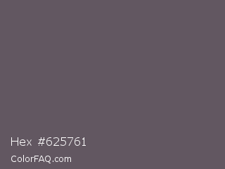 Hex #625761 Color is a normal magenta color and the nearest color is Scarpa Flow #585562. Hex code #625761 and RGB value is rgb(98,87,97). In RGB color space, this color is composed of 38% red, 34% green, 38% blue, In CMYK color space, this color is composed of 0% cyan, 11% magenta, 1% yellow , 62% black , In HSL color space, this color has a hue angle of 305° , 6% saturation and 36% lightness.