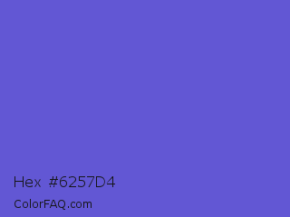 Hex #6257d4 Color is a normal indigo color and the nearest color is Majorelle Blue #6050dc. Hex code #6257d4 and RGB value is rgb(98,87,212). In RGB color space, this color is composed of 38% red, 34% green, 83% blue, In CMYK color space, this color is composed of 54% cyan, 59% magenta, 0% yellow , 17% black , In HSL color space, this color has a hue angle of 245° , 59% saturation and 59% lightness.