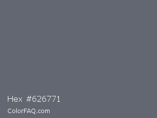 Hex #626771 Color is a normal blue color and the nearest color is Shuttle Gray #5f6672. Hex code #626771 and RGB value is rgb(98,103,113). In RGB color space, this color is composed of 38% red, 40% green, 44% blue, In CMYK color space, this color is composed of 13% cyan, 9% magenta, 0% yellow , 56% black , In HSL color space, this color has a hue angle of 220° , 7% saturation and 41% lightness.