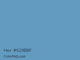 Hex #629bbf Color is a normal blue color and the nearest color is Cerulean Frost #6d9bc3. Hex code #629bbf and RGB value is rgb(98,155,191). In RGB color space, this color is composed of 38% red, 61% green, 75% blue, In CMYK color space, this color is composed of 49% cyan, 19% magenta, 0% yellow , 25% black , In HSL color space, this color has a hue angle of 203° , 42% saturation and 57% lightness.
