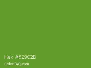 Hex #629c2b Color is a normal green color and the nearest color is Maximum Green #5e8c31. Hex code #629c2b and RGB value is rgb(98,156,43). In RGB color space, this color is composed of 38% red, 61% green, 17% blue, In CMYK color space, this color is composed of 37% cyan, 0% magenta, 72% yellow , 39% black , In HSL color space, this color has a hue angle of 91° , 57% saturation and 39% lightness.