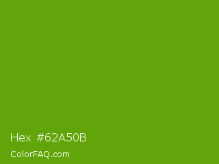 Hex #62a50b Color is a normal green color and the nearest color is Christi #67a712. Hex code #62a50b and RGB value is rgb(98,165,11). In RGB color space, this color is composed of 38% red, 65% green, 4% blue, In CMYK color space, this color is composed of 41% cyan, 0% magenta, 93% yellow , 35% black , In HSL color space, this color has a hue angle of 86° , 88% saturation and 35% lightness.