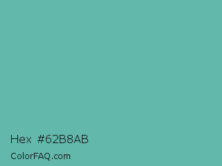 Hex #62b8ab Color is a normal cyan color and the nearest color is Tradewind #5fb3ac. Hex code #62b8ab and RGB value is rgb(98,184,171). In RGB color space, this color is composed of 38% red, 72% green, 67% blue, In CMYK color space, this color is composed of 47% cyan, 0% magenta, 7% yellow , 28% black , In HSL color space, this color has a hue angle of 171° , 38% saturation and 55% lightness.