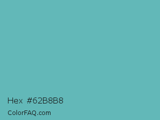Hex #62b8b8 Color is a normal cyan color and the nearest color is Tradewind #5fb3ac. Hex code #62b8b8 and RGB value is rgb(98,184,184). In RGB color space, this color is composed of 38% red, 72% green, 72% blue, In CMYK color space, this color is composed of 47% cyan, 0% magenta, 0% yellow , 28% black , In HSL color space, this color has a hue angle of 180° , 38% saturation and 55% lightness.