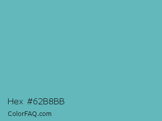 Hex #62b8bb Color is a normal cyan color and the nearest color is Fountain Blue #56b4be. Hex code #62b8bb and RGB value is rgb(98,184,187). In RGB color space, this color is composed of 38% red, 72% green, 73% blue, In CMYK color space, this color is composed of 48% cyan, 2% magenta, 0% yellow , 27% black , In HSL color space, this color has a hue angle of 182° , 40% saturation and 56% lightness.