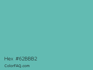 Hex #62bbb2 Color is a normal cyan color and the nearest color is Tradewind #5fb3ac. Hex code #62bbb2 and RGB value is rgb(98,187,178). In RGB color space, this color is composed of 38% red, 73% green, 70% blue, In CMYK color space, this color is composed of 48% cyan, 0% magenta, 5% yellow , 27% black , In HSL color space, this color has a hue angle of 174° , 40% saturation and 56% lightness.