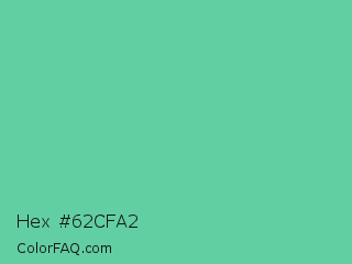 Hex #62cfa2 Color is a normal green color and the nearest color is Medium Aquamarine #66ddaa. Hex code #62cfa2 and RGB value is rgb(98,207,162). In RGB color space, this color is composed of 38% red, 81% green, 64% blue, In CMYK color space, this color is composed of 53% cyan, 0% magenta, 22% yellow , 19% black , In HSL color space, this color has a hue angle of 155° , 53% saturation and 60% lightness.