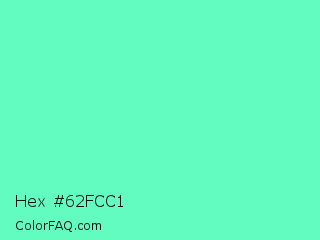 Hex #62fcc1 Color is a light green color and the nearest color is Aquamarine #7fffd4. Hex code #62fcc1 and RGB value is rgb(98,252,193). In RGB color space, this color is composed of 38% red, 99% green, 76% blue, In CMYK color space, this color is composed of 61% cyan, 0% magenta, 23% yellow , 1% black , In HSL color space, this color has a hue angle of 157° , 96% saturation and 69% lightness.