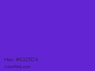 Hex #6325d4 Color is a normal violet color and the nearest color is Purple Heart Crayola #652dc1. Hex code #6325d4 and RGB value is rgb(99,37,212). In RGB color space, this color is composed of 39% red, 15% green, 83% blue, In CMYK color space, this color is composed of 53% cyan, 83% magenta, 0% yellow , 17% black , In HSL color space, this color has a hue angle of 261° , 70% saturation and 49% lightness.