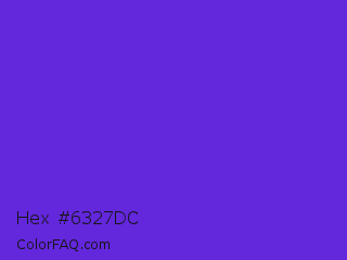 Hex #6327dc Color is a normal indigo color and the nearest color is Purple Heart Crayola #652dc1. Hex code #6327dc and RGB value is rgb(99,39,220). In RGB color space, this color is composed of 39% red, 15% green, 86% blue, In CMYK color space, this color is composed of 55% cyan, 82% magenta, 0% yellow , 14% black , In HSL color space, this color has a hue angle of 260° , 72% saturation and 51% lightness.