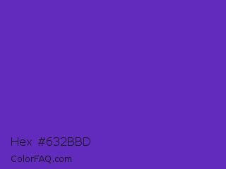 Hex #632bbd Color is a normal violet color and the nearest color is Purple Heart Crayola #652dc1. Hex code #632bbd and RGB value is rgb(99,43,189). In RGB color space, this color is composed of 39% red, 17% green, 74% blue, In CMYK color space, this color is composed of 48% cyan, 77% magenta, 0% yellow , 26% black , In HSL color space, this color has a hue angle of 263° , 63% saturation and 45% lightness.