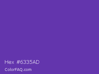 Hex #6335ad Color is a normal violet color and the nearest color is Grape #6f2da8. Hex code #6335ad and RGB value is rgb(99,53,173). In RGB color space, this color is composed of 39% red, 21% green, 68% blue, In CMYK color space, this color is composed of 43% cyan, 69% magenta, 0% yellow , 32% black , In HSL color space, this color has a hue angle of 263° , 53% saturation and 44% lightness.