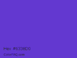 Hex #6338d0 Color is a normal indigo color and the nearest color is Purple Heart Crayola #652dc1. Hex code #6338d0 and RGB value is rgb(99,56,208). In RGB color space, this color is composed of 39% red, 22% green, 82% blue, In CMYK color space, this color is composed of 52% cyan, 73% magenta, 0% yellow , 18% black , In HSL color space, this color has a hue angle of 257° , 62% saturation and 52% lightness.