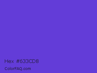 Hex #633cd8 Color is a normal indigo color and the nearest color is Majorelle Blue #6050dc. Hex code #633cd8 and RGB value is rgb(99,60,216). In RGB color space, this color is composed of 39% red, 24% green, 85% blue, In CMYK color space, this color is composed of 54% cyan, 72% magenta, 0% yellow , 15% black , In HSL color space, this color has a hue angle of 255° , 67% saturation and 54% lightness.